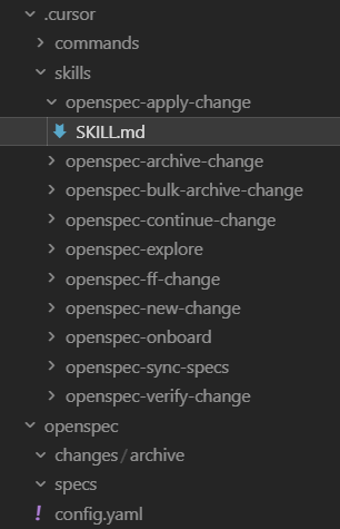 The init command set up these folders with markdown files. For Cursor, these files add skills—specialized instructions that guide the AI through OpenSpec’s workflow for creating proposals, designs, and specifications.